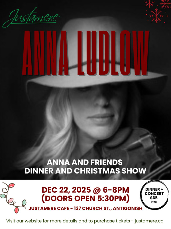 Anna is finally bringing her beloved Ottawa Christmas tradition home to Antigonish! Join us for a heartwarming evening filled with timeless Christmas classics, joyful sing-alongs, and all your favourite festive tunes. You won’t want to miss this magical night of music and holiday cheer!
